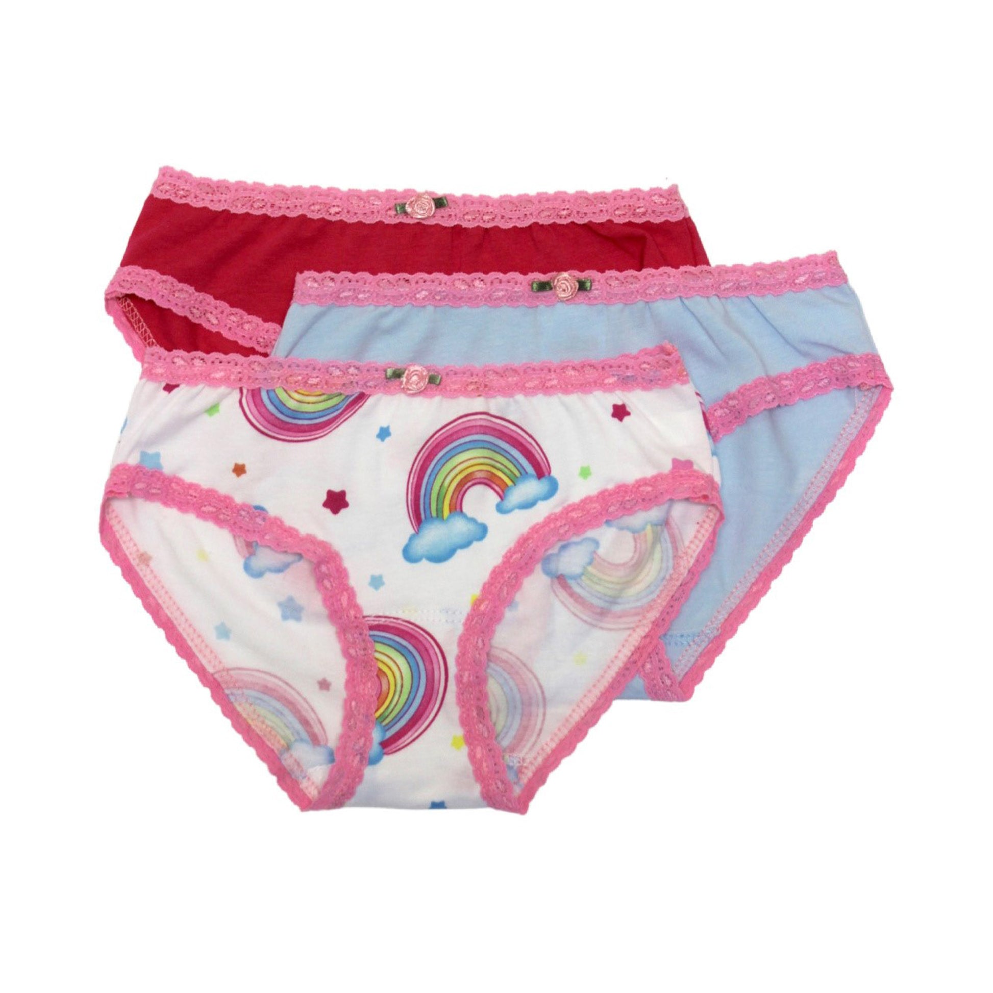 Girls the most Comfortable Cute Underwear Panties, pack of 3 (or 7). Esme Girls underwear are the most comfortable underwear around. Esme pack all panties are with lace trim. These girls underwear are super soft and so comfortable you will want to live in them. Come in a decorative organza bag with satin ribbon bow tie. Made in USA.